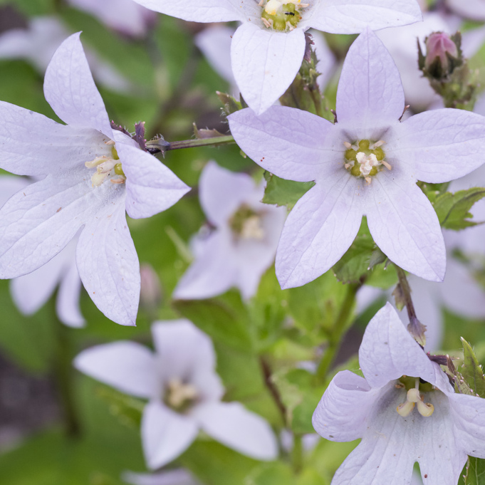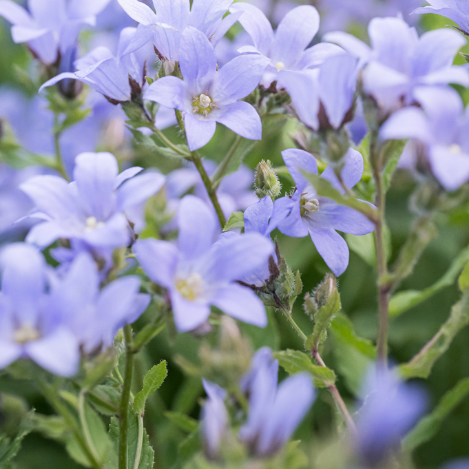 Dzwonek skupiony - oprócz gatunku w uprawie znajdują się odmiany, różniące się wysokością i kolorem kwiatów. Gatunek osiąga 50 cm wysokości, natomiast odmiany od 20-60 cm. Roślina rozrasta się niezbyt silnie dzięki podziemnym rozłogom. Liście odziomkowe ogonkowe oraz liście łodygowe siedzące, pokryte są ostrymi ciemnofioletowymi włoskami. Dzwonkowate, miododajne kwiaty osadzone w kątach górnych liści zebrane są w gęste, główkowate kwiatostany. Od czerwca do sierpnia dzwonek skupiony pokrywa się białymi lub ciemnofioletowymi kwiatami. Znany i lubiany dzwonek, często sadzony na rabatach i w ogrodach skalnych. Preferuje stanowiska ciepłe i nasłonecznione. Jeśli chodzi o glebę to najlepsze wyniki uzyskuje się na podłożu suchym lub średnio wilgotnym. Bylina poradzi sobie nawet na glebie bardzo ubogiej, nie zniesie natomiast zastoisk wodnych.