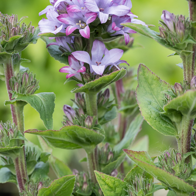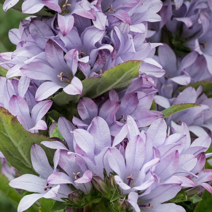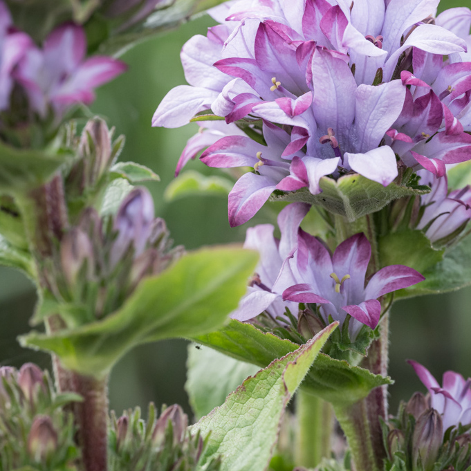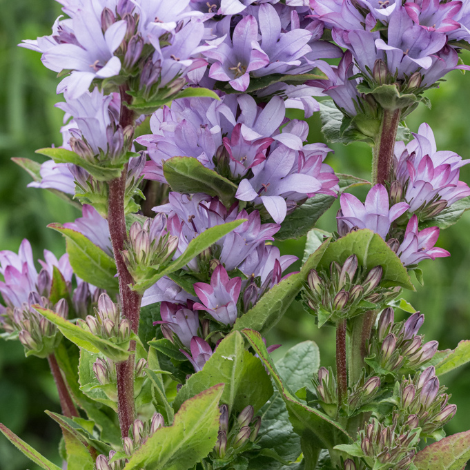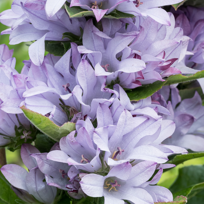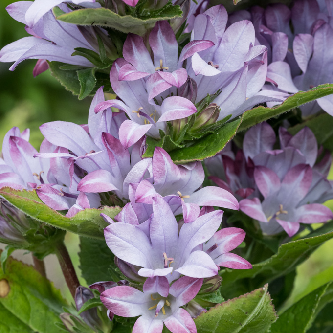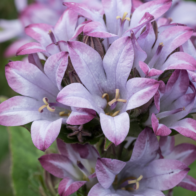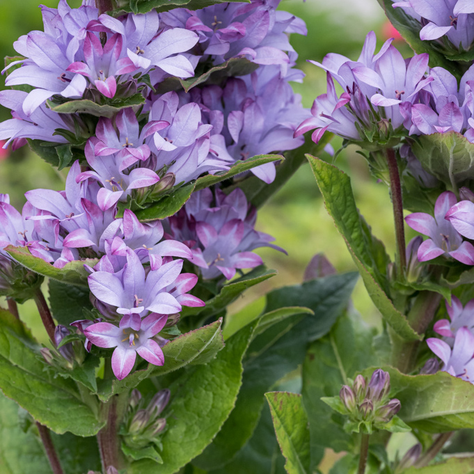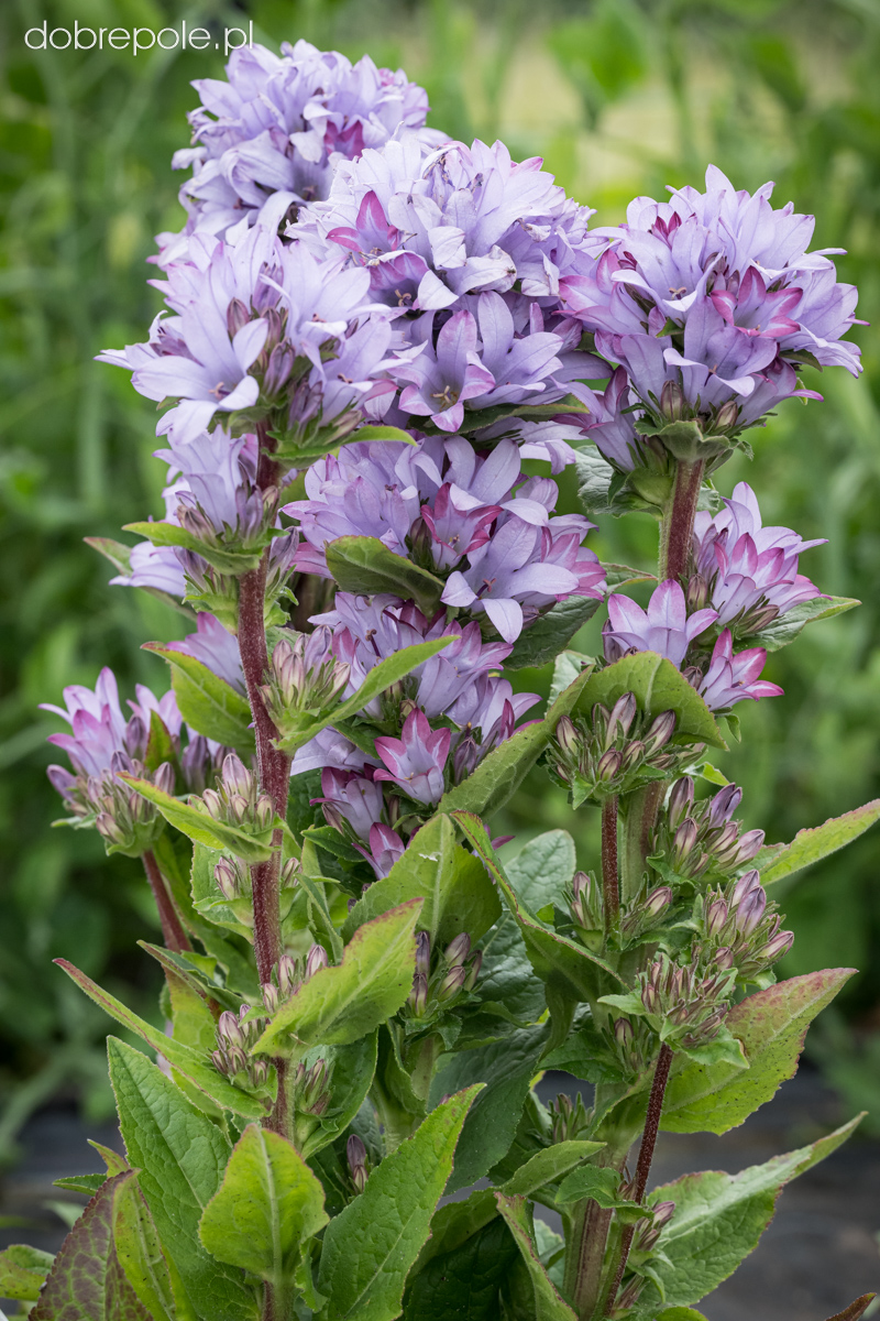 Dzwonek skupiony - oprócz gatunku w uprawie znajdują się odmiany, różniące się wysokością i kolorem kwiatów. Gatunek osiąga 50 cm wysokości, natomiast odmiany od 25-60 cm. Roślina rozrasta się niezbyt silnie dzięki podziemnym rozłogom. Liście odziomkowe ogonkowe oraz liście łodygowe siedzące, pokryte są ostrymi ciemnofioletowymi włoskami. Dzwonkowate, miododajne kwiaty osadzone w kątach górnych liści zebrane są w gęste, główkowate kwiatostany. Od czerwca do sierpnia dzwonek skupiony pokrywa się białymi lub ciemnofioletowymi kwiatami. Znany i lubiany dzwonek, często sadzony na rabatach i w ogrodach skalnych. Preferuje stanowiska ciepłe i nasłonecznione. Jeśli chodzi o glebę to najlepsze wyniki uzyskuje się na podłożu suchym lub średnio wilgotnym. Bylina poradzi sobie nawet na glebie bardzo ubogiej, nie zniesie natomiast zastoisk wodnych.